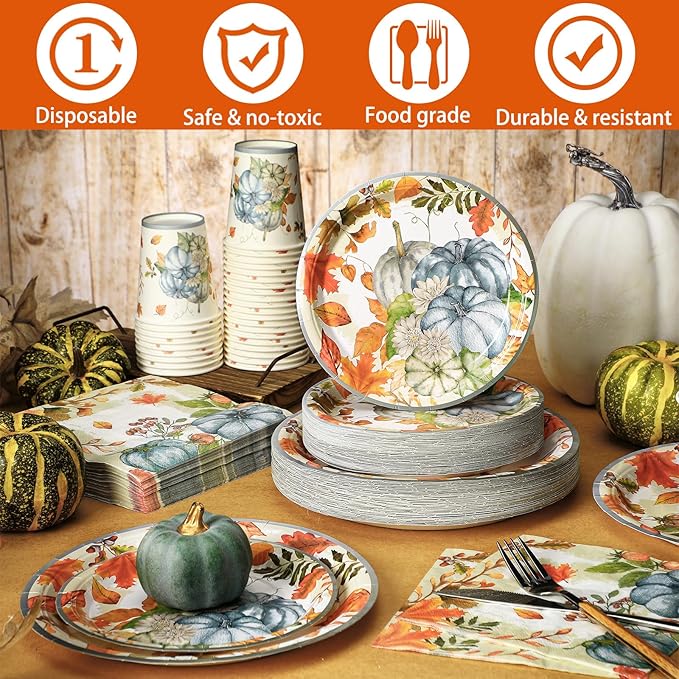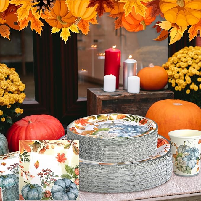 - Exquisite Design: our autumn pumpkin paper plate set has a blue green pumpkin background, elegant and beautiful; It can be well paired with certain occasions or table decorations to add charm to your home; This design is natural and elegant, making people feel relaxed and comfortable; We believe that your customers will appreciate beautiful and simple designs
