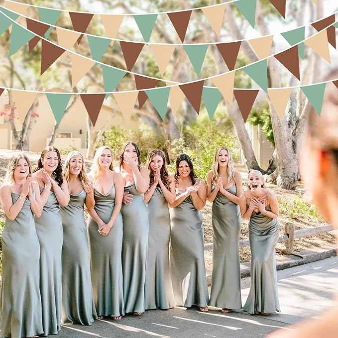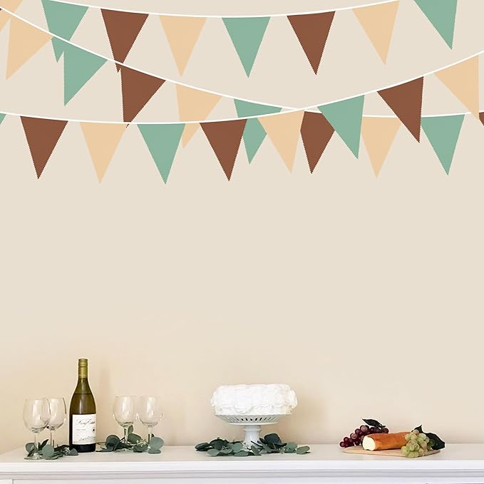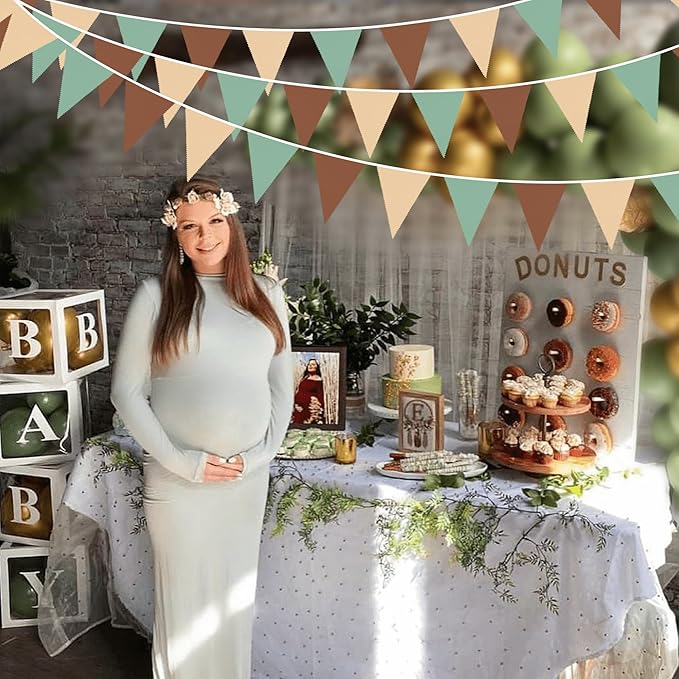 - Package Including:1 pack green brown fabric bunting banner garland in sage green, brown and light brown colors, with 36pcs flags in 10M/32.8Feet. Flag Size: 5.5in width x 7in height.