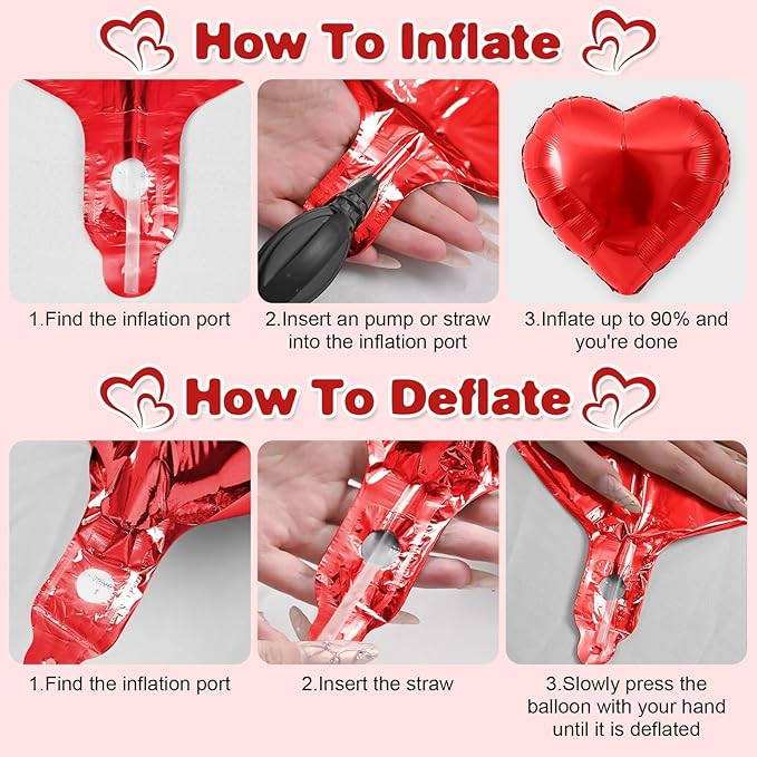 - 【EASY USE】Our heart shaped foil balloons are very easy to inflate,the straw inside the package helps you to inflate the balloon, the balloon can be filled with air and helium,after filling the balloon,you can pinch your finger to the position of the inflatable mouth to seal it automatically.