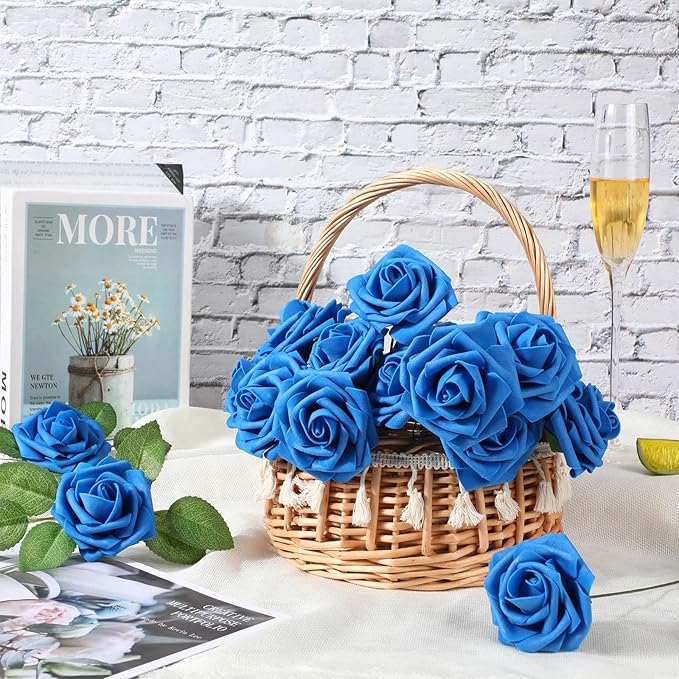 100 Pieces Artificial Foam Rose Flowers Faux Bouquet with Leaves and Stems for DIY Wedding Bouquets Centerpieces Bridal Shower Party Valentine Home Decorations(Royal Blue)