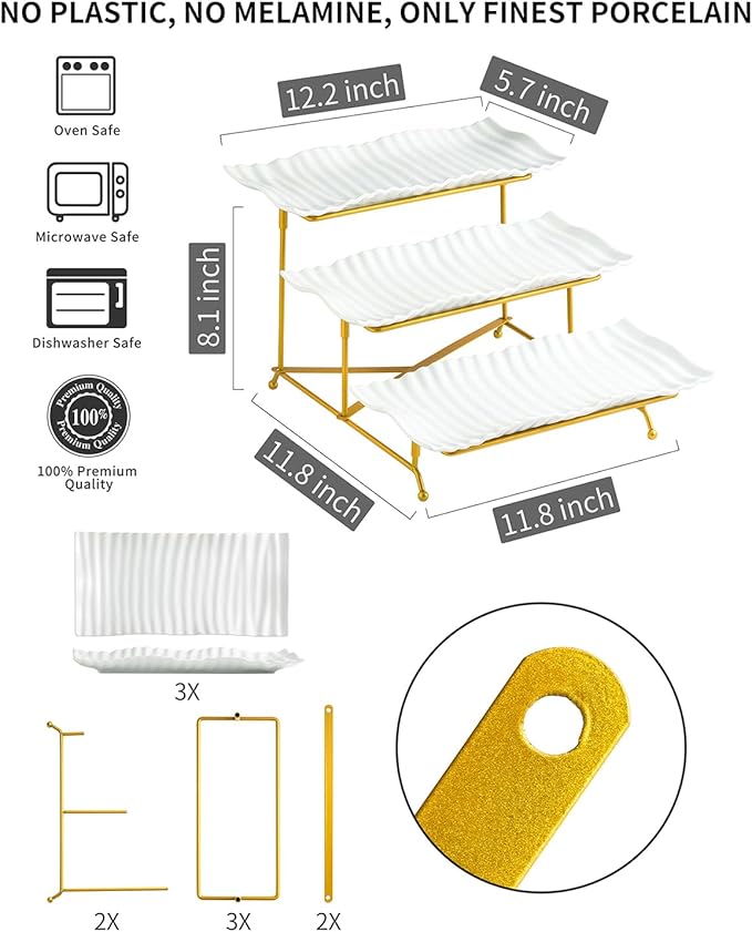 LAUCHUH 3 Tier Trays Stand, Porcelain Serving Trays Collapsible Sturdier Stand Serving Platters Dessert Table Display Set for Indoor Party, Entertaining, Thanksgiving, Christmas, Gold, 12.2 Inch