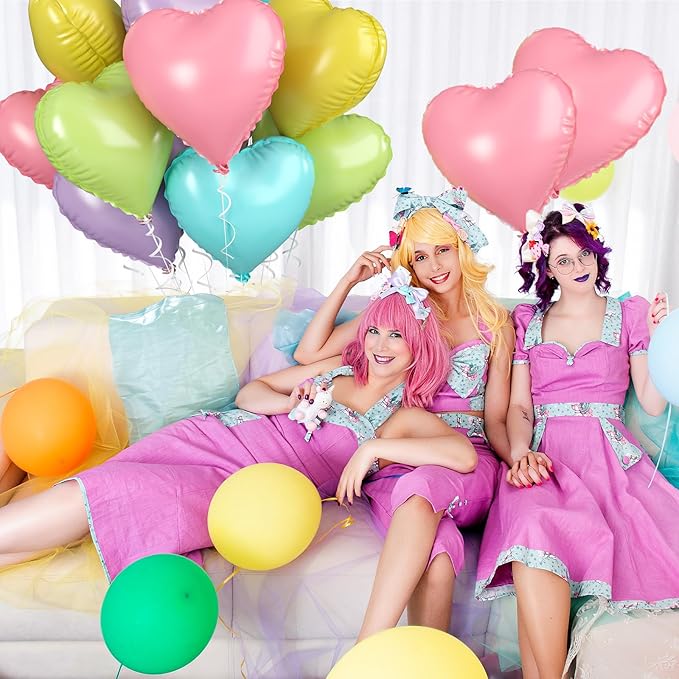 - 10 PCS Macaron Heart Balloons: Contains 2 x 18 inches pastel pink heart shaped balloons, 2 x 18 inches purple heart shaped balloons, 2 x 18 inches green balloons, 2 x 18 inches teal balloons, 2 x 18 inches yellow balloons, 1 x 10m ribbon. The pastel foil heart balloons are specially designed to add a touch of fun and surprise to any party or holiday celebration. With a size of 18 inches, they are the perfect addition to your decorating needs, leaving your guests with an unforgettable smile!