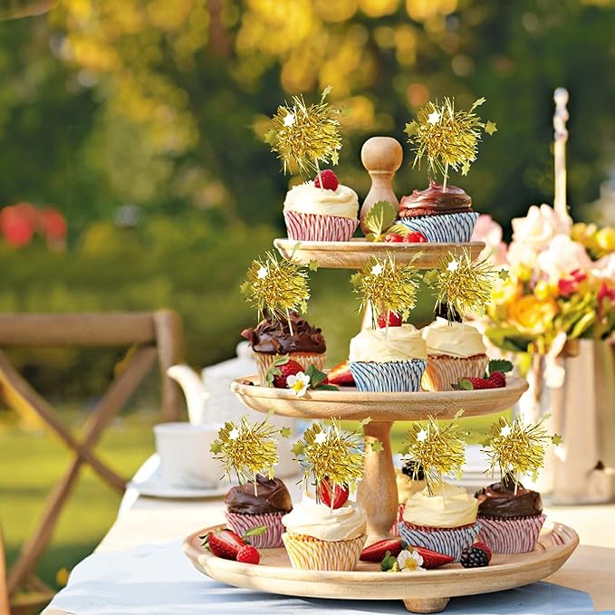 Gyufise 30Pcs Star Foil Firework Cupcake Toppers Sparkle Tinsel Cake Toppers Tinsel Drink Cake Decoration Cocktail Picks for Birthday Wedding Graduation Party Supplies Gold