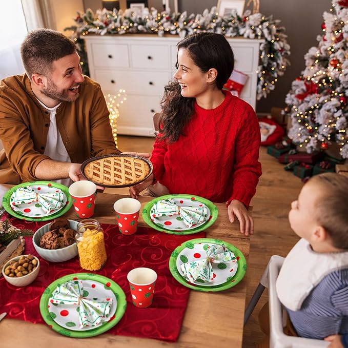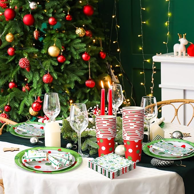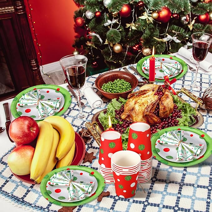 - Delicate Gifts Set: the christmas green decorations set includes 50 pieces of 9 inch plates, 50 pieces of 7 inch dessert plates, 50 pieces of 9 ounce cups, and 100 napkins to meet your daily dining table decoration needs; The christmas party cutlery combination really adds dimension to your christmas green party, as your guests will love beautiful and unique designs that add color to your party; You can store excess paper trays for future use, or give them as gifts to multiple family members or friends
