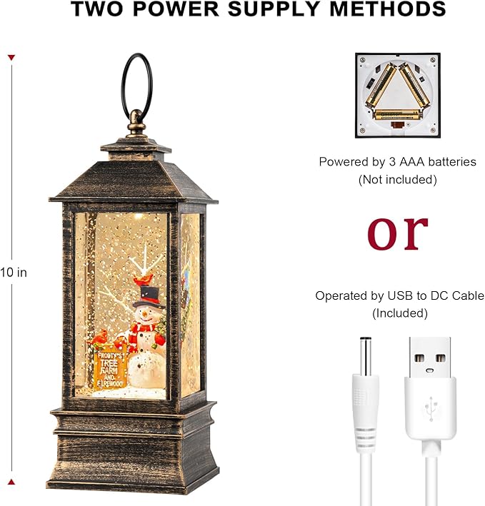 - 【Two power supply methods】The first is a direct USB (included). The USB cable allows you to operate the snow globe lantern without using the battery. The other is powered by 3 AAA batteries (not included), so you can place it anywhere.