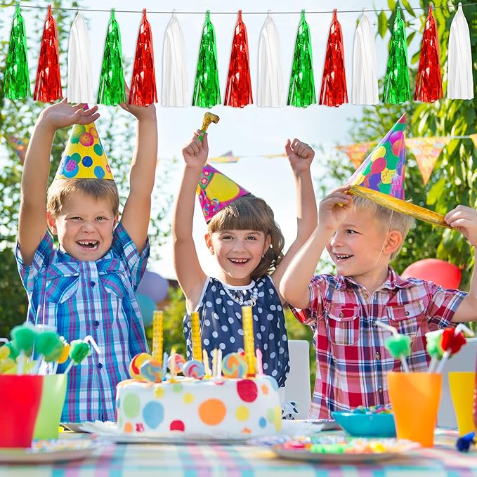 - 【Red Green White Party Supplies Set】: The total length of the Red Green White birthday tassels banner is 39.4 feet, divided into 4 strips, each 9.8 feet long. Each banner contains 15 tassels, and each tassel measures 14 inches, for birthday decorations many occasions, and so on