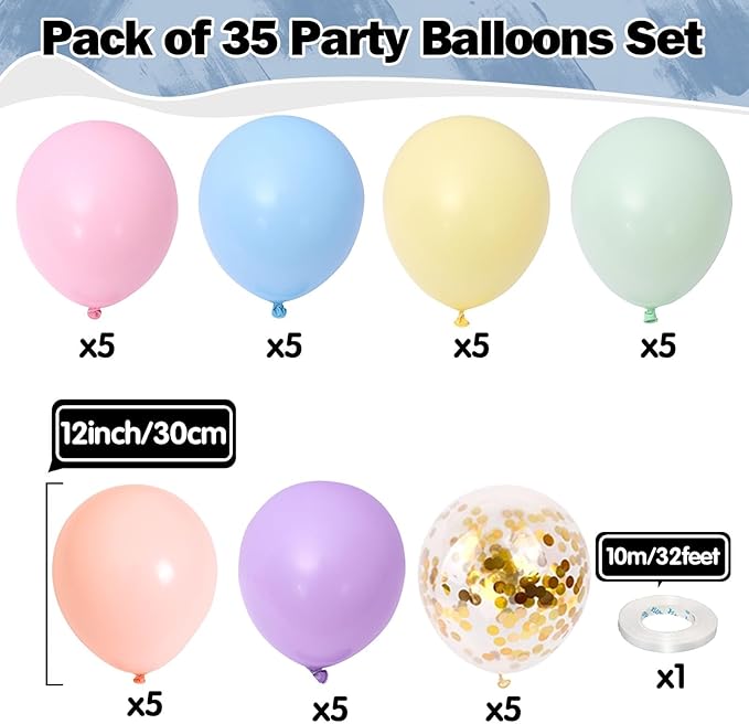 - 🎈Package Includes - You'll get 35 pieces 12 inch party balloons (5pcs pastel pink balloons, 5pcs pastel blue balloons, 5pcs pastel purple balloons, 5pcs pastel yellow balloons, 5pcs pastel green balloons, 5pcs pastel orange balloons, 5pcs gold confetti balloons) and 1 roll of 10m ribbon, which are enough to decorate your party, these dazzling colors will make your party very attractive, a great way to decorate any theme party. You can make balloons or balloon arch garland backdrop decorations.