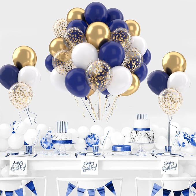 - Package Include: Our blue and gold balloons kit includes 15 pcs metallic gold balloons, 15 pcs navy blue balloons, 10 pcs white balloons, 10 pcs gold confetti balloons, 1 gold ribbon and 1 blue ribbon