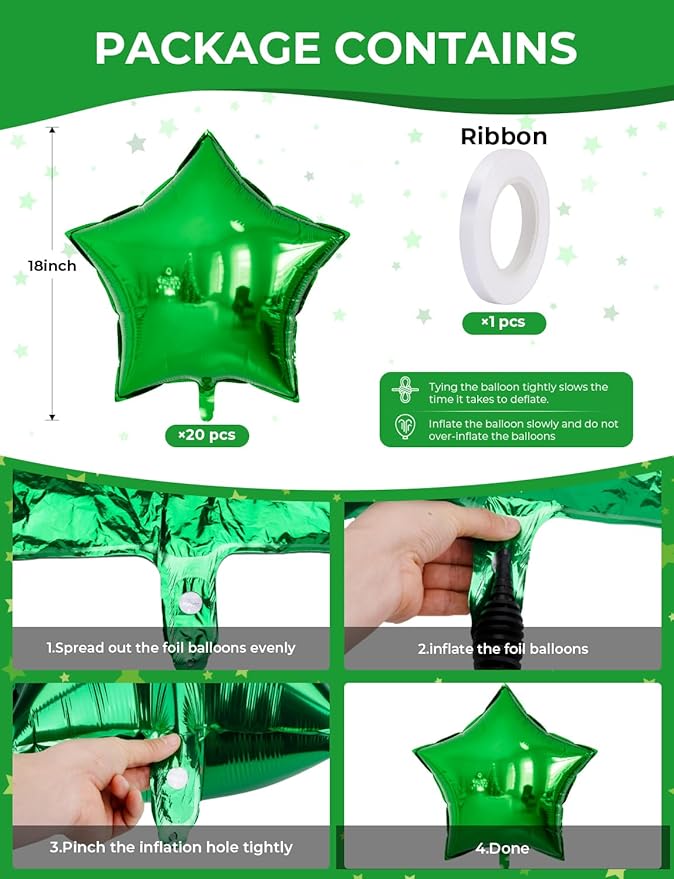 - Green Mylar Balloons: The package includes 20 pcs 18 inch star balloons,1 piece of white ribbon.These star balloons are the ideal decorations for both indoors and outdoors, and you can combine them with other balloons and streamers to create a beautiful and romantic atmosphere.