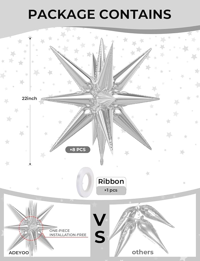 - Explosion Star Balloons: You will get 8 pcs 22inch silver mylar balloons,1 piece of ribbon. You can place the star balloons in any place, adding an eye-catching touch to your party.