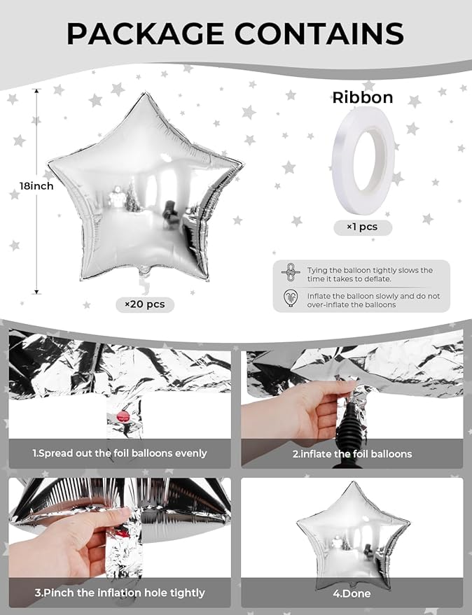 - Silver Star Balloons: You will get 20 pcs 18inch star mylar balloons and 1 piece of ribbon.These star balloons are the ideal decorations for both indoors and outdoors, and you can combine them with other balloons and streamers to create a beautiful and romantic atmosphere.