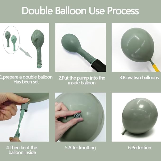 - Dusty Green Balloon Garland: Double stuffed dusty green balloon (5inx10,12inx15,18inx2), matte purple balloon (12inx10,18inx2), pastel pink balloon (5inx10,12inx10,18inx1), light yellow balloon (12inx10). Single layer dusty pink balloon (5inx15,12inx10).Everything you need are in green pink yellow balloon arch. You'll get nice decor effect with dusty pink green balloons! If you want to make a rich dusty green balloon arch, we recommend purchasing 2 balloon sets