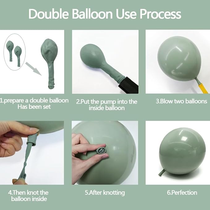 - Green Pink Balloon Garland: Double stuffed peach pink balloon (5inx15,12inx10,18inx2), dusty green balloon (5inx15,12inx10,18inx2), sand white balloon (5inx10,12inx10,18inx1), cream white balloon (12inx10). A 16ft balloon strip tape. 100pcs glue point. A 33ft white curling ribbon. Everything you need are in sage green and pink cream balloon arch kit. You'll get nice decor effect with green pink white balloons! If you want to make a rich blush pink green balloon arch, we recommend purchasing 2 balloon sets