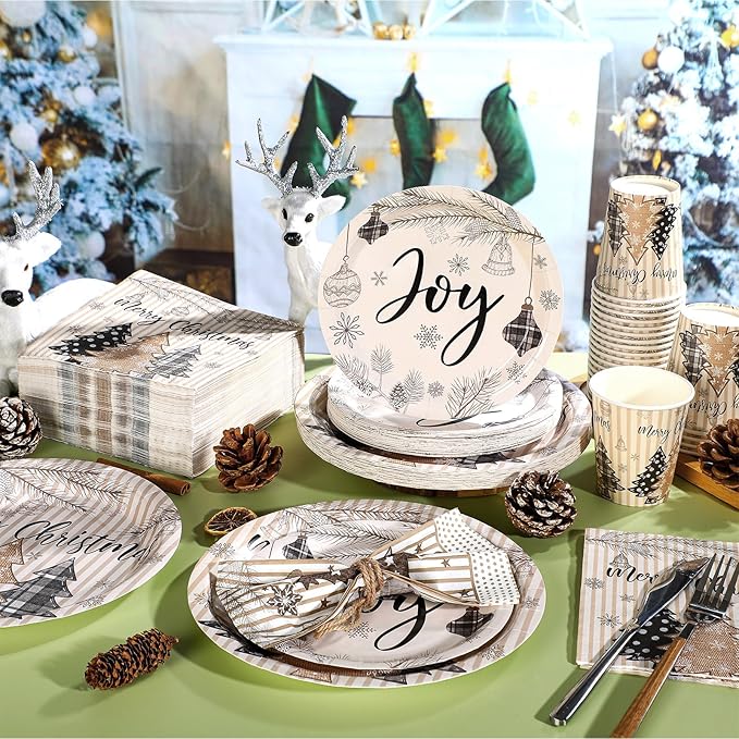 - Delicate Gifts Set: the Christmas decorations set includes 50 pieces of 9 inch plates, 50 pieces of 7 inch dessert plates, 50 pieces of 9 ounce cups, and 100 napkins to meet your daily dining table decoration needs; The Christmas party cutlery combination really adds dimension to your Christmas party, as your guests will love beautiful and unique designs that add color to your party; You can store excess paper trays for future use, or give them as gifts to multiple family members or friends