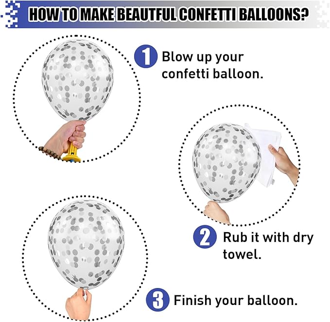 - 🎈How to Use: These navy blue silver latex balloons can be inflated with helium or air. Please rub the confetti balloons several times on hair or clothes before inflating, which ensures that the inner confetti can adhere to the inside of the balloon to get a better effect.