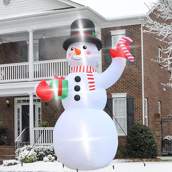 - Holiday Design - This 14ft tall Christmas snowman blow up decoration wearing a hat and scarf, holding a Christmas present in one hand and a candy cane in the other beckoning to you. Large enough to be easily appealing and get everyone in the festive spirit