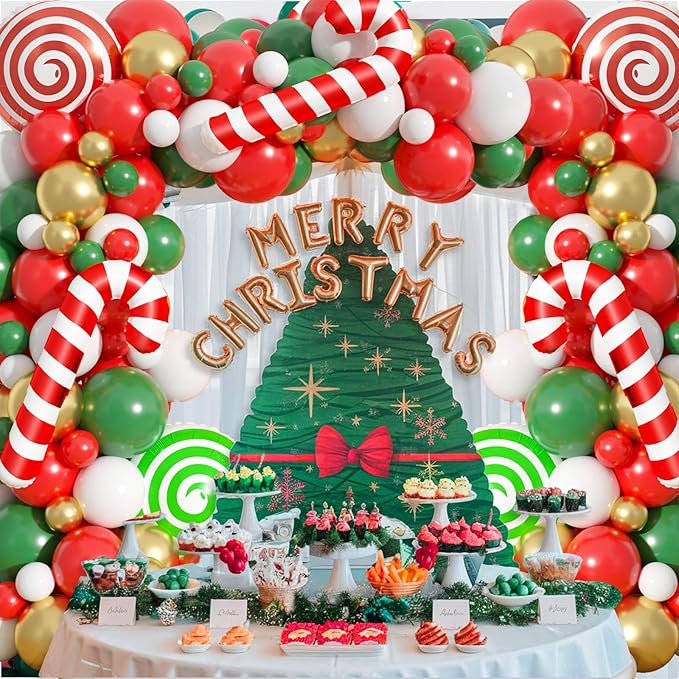 - Christmas Balloon Arch: Our green red Christmas balloon garland kit includes: dark green balloons (4x12in, 20x10in, 8x5in), red balloons (4x12in, 20x10in, 8x5in), white balloons (10x10in, 6x5in), metallic gold balloons (10x10in, 6x5in), red candy cane balloons (2x33in), red candy balloons (1x18in), green candy balloons (1x18in), ribbon (1x32feet), along with a balloon strip and 2 dispensers.