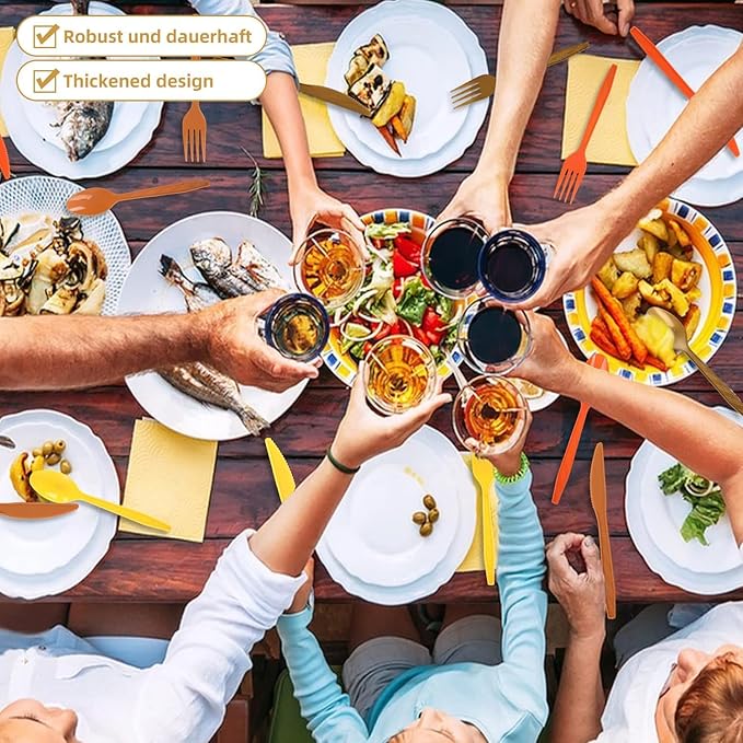 - Easy Cleanup & Festive Colors: Available in a vibrant combination of Red, Orange, Yellow, and Brown, these disposable utensils add a festive and joyful touch to any occasion. Simply toss the utensils after use for a quick and effortless cleanup. These bold colors are perfect for seasonal parties like Christmas, New Year, Thanksgiving, and Fall gatherings, creating a lively and welcoming atmosphere for your guests.