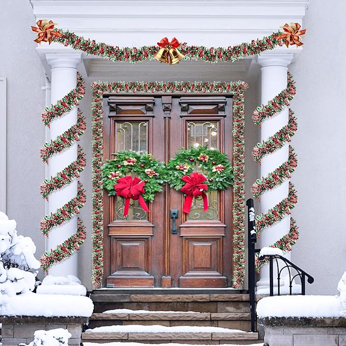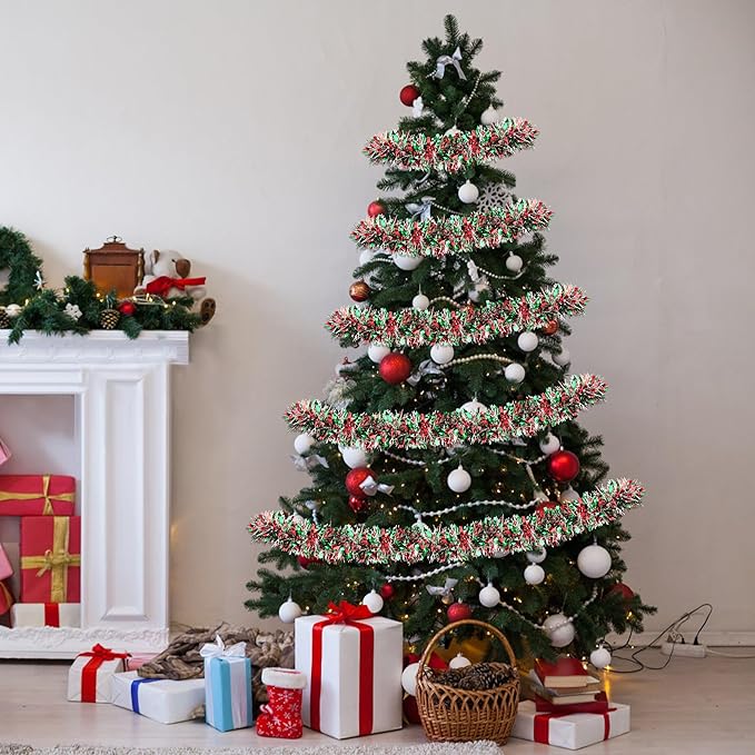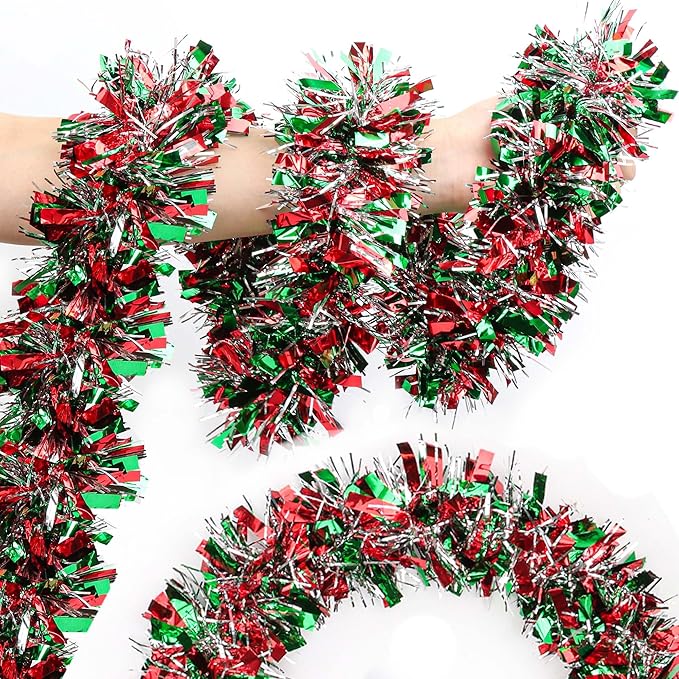 - [ Unique Thick Tinsel Design ]: This garland features wide, metallic tinsel that shimmers beautifully in the light. Designed in classic Christmas colors, it’s packed with sparkle to enhance your holiday atmosphere.