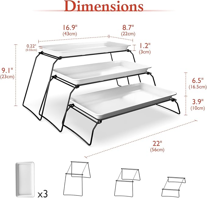 - Large Capacity: This set includes 3 platters and 3 separate stands.The total height of the set is 9.1”(23.37cm). Each plate measures 17”(43cm) x 8.7”(22cm)x1.2“(3cm), with a sturdy edge thickness of 0.22”(0.6cm). This tray has plenty of space for desserts, deli items, appetizers, and fruits. The 3 17-inch platters can be used separately and holds at least 63 cupcakes—perfect for large events.
