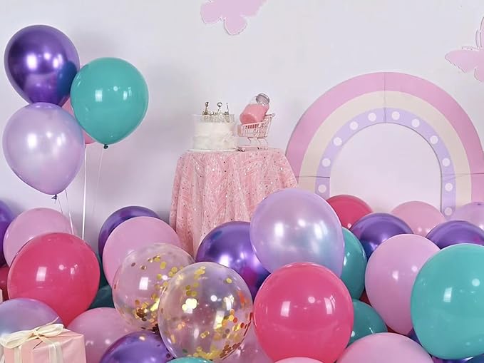 - Pink and Purple Balloons:You will receive this 60pcs 12-inch pink and purple balloons, which includes 6 colors. 10pcs matte hot pink balloons, 10pcs matte teal blue balloons, 10pcs metallic purple balloons, 10pcs pastel pink balloons, 10pcs light purple balloons, 5pcs gold confetti balloons. Accompanying by a 10M ribbon. Pink and purple color for girls decoration will embellish your theme party