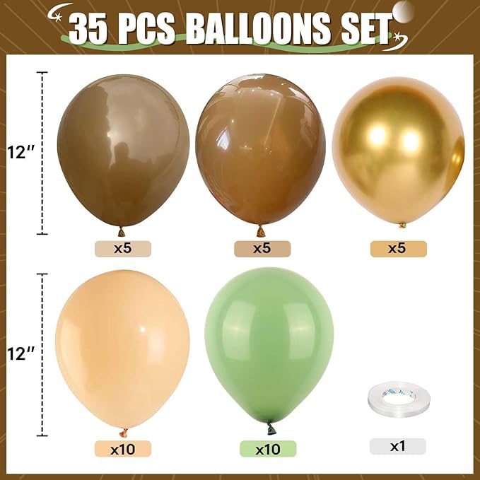 - Green and Brown Balloons:You will receive this 35pcs 12-inch green and brown balloons, which includes 5 colors. 10pcs olive balloons, 5pcs matte brown balloons, 5pcs beige balloons, 5pcs metallic gold balloons, 10pcs apricot balloons. Accompanying by a 10M ribbon. Jungle safari colored balloons will embellish your theme party!