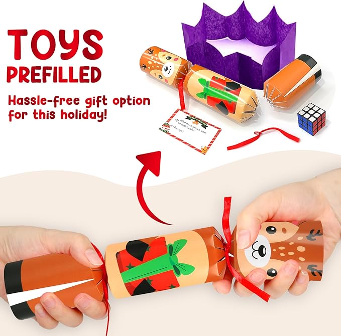 - [ Christmas Super Value ] Christmas party table favors set includes 10 packs of no-snaps party favors. Each party favor contains a party paper hat, a Christmas joke paper and a random gift inside