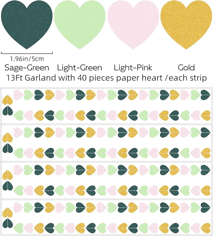 - 【Package Including】The decorations include 4 pack pink,dark-green,light-green Gold paper heart garland,each garland is approx 13ft in length,totally 52ft in length.Each one has 40 pieces.