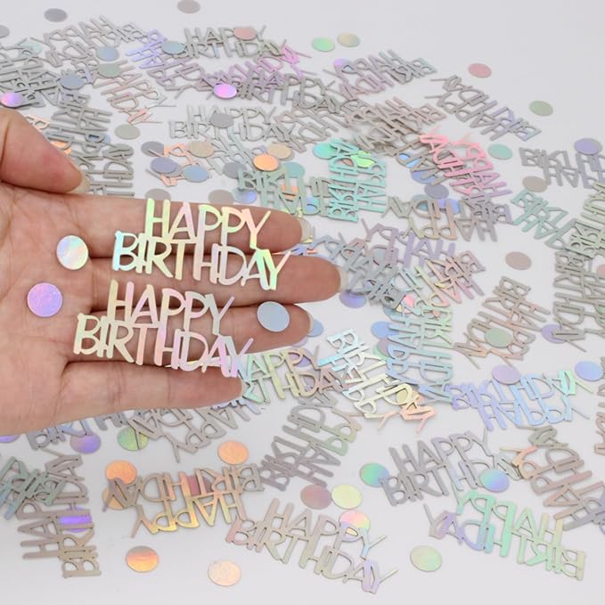 - Material: Happy birthday confetti for table is made of glitter iridescent card. The iridescent confetti is indelible, reusable, and sparkling in the sunlight, and it’s a very attractive presence wherever it goes
