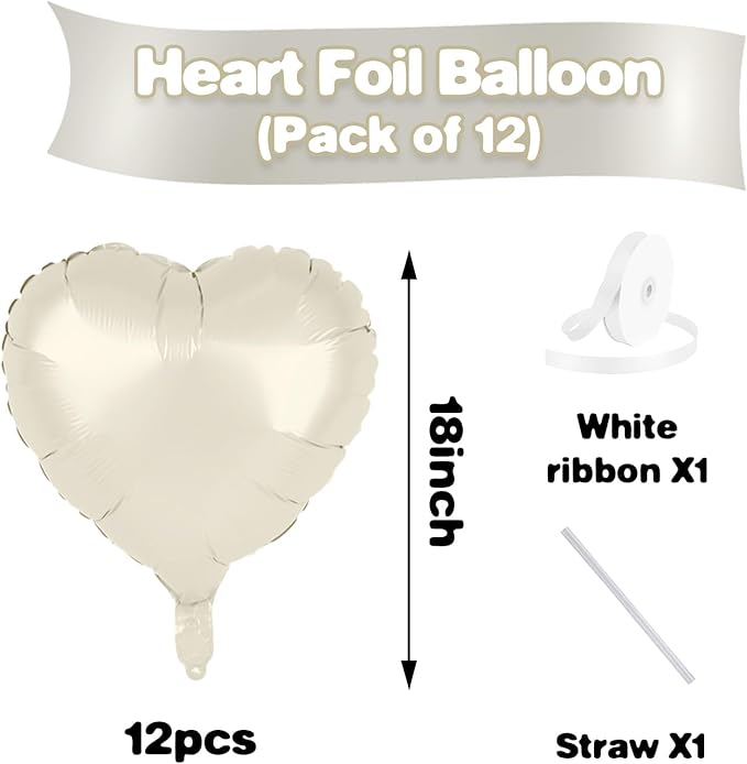 - Cream Heart balloons: The package includes 12pcs 18-inch cream heart balloons,1 roll white ribbon and 1 straw.Great for creating a romantic and cheerful atmosphere. Whether you're celebrating a wedding, baby shower, or Valentine's Day, these cream heart balloons add a beautiful touch to your special event.
