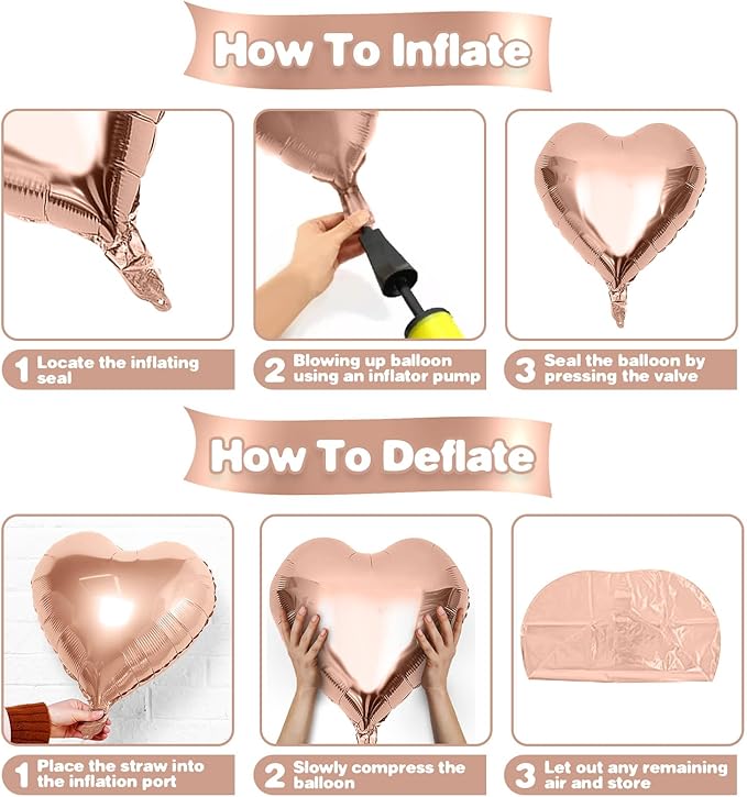 - Easy Setup: Inflate the rose gold pink heart balloons with a balloon pump or helium tank. After inflating, secure the rose gold pink heart balloons with the included ribbon for a polished look. These rose gold pink heart balloons are easy to assemble and disassemble, making decorating quick and effortless.