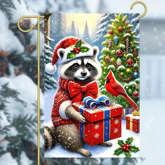 - [CHRISTMAS SCENE]: Celebrate the festive season with this charming Christmas garden flag featuring a raccoon in a Santa hat holding a gift beside a cardinal and a decorated tree. Perfect for adding holiday cheer to your yard or garden with vibrant seasonal imagery.