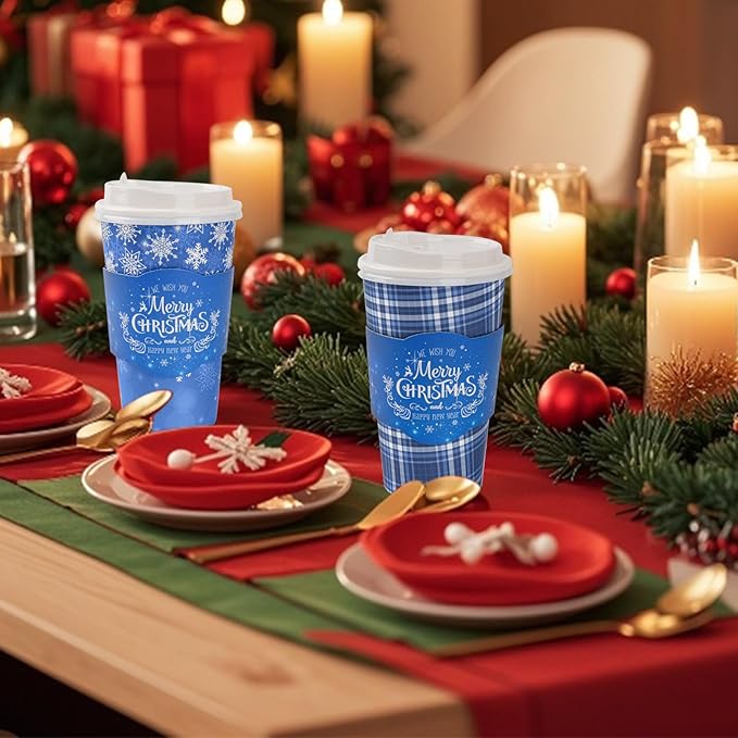 72 Set Christmas Disposable Coffee Cups with Lids and Sleeves Snowflake Reindeer Paper Drinking To Go Cups for Winter Holiday Christmas Party Coffee Bar Decor Business Supplies (Blue)
