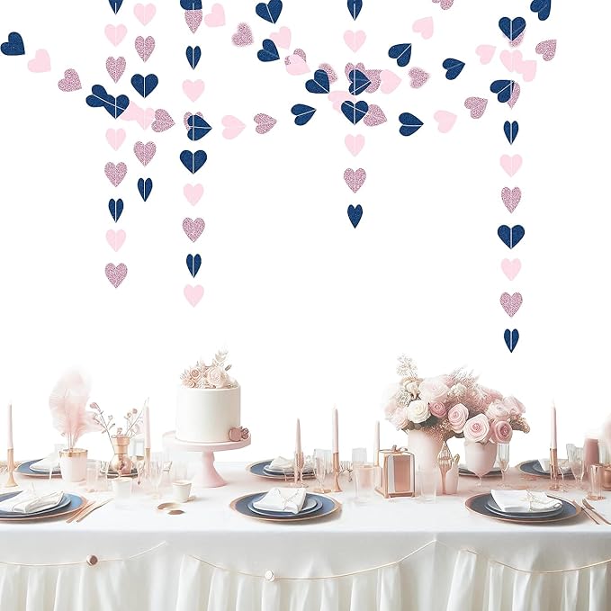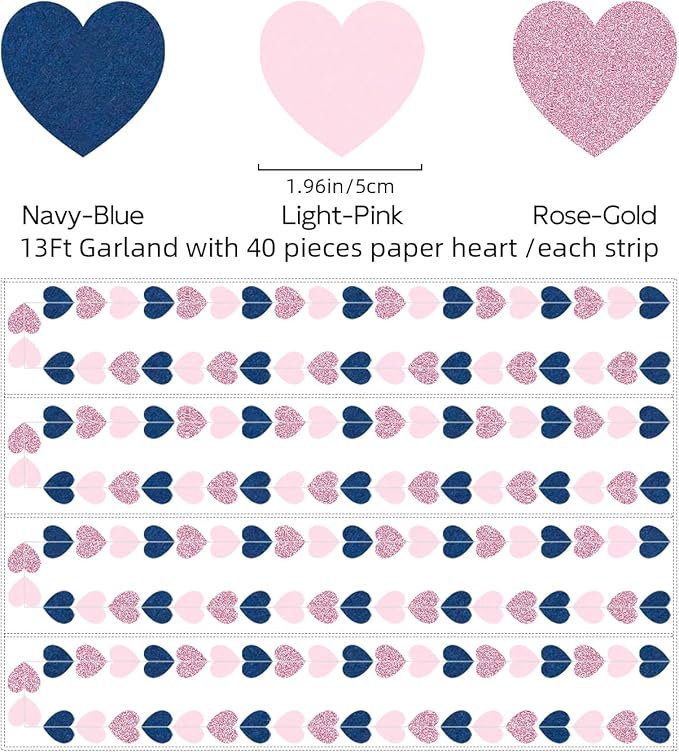- 【Package Including】The decorations include 4 pack navy blue pink rose gold paper heart garland,each garland is approx 13ft in length,totally 52ft in length.Each one has 40 pieces.