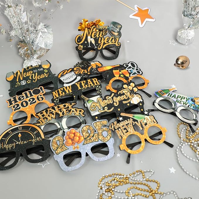 - πγ NEW YEAR EYEGLASSES γ: Includes 12 pcs new year glasses, each adding a fun, festive touch to your 2026 new year party. With classic designs like champagne, firework, 2026