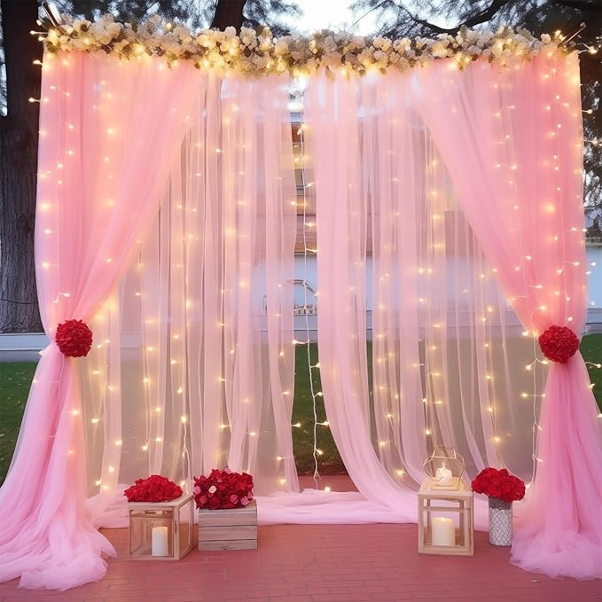 - Backdrop Curtains with Lights: Your package will come 2 panels pink sheer backdrop curtains with lights, 9.8ft warm white string light and 12pcs transparent clips. Not only does pink tulle backdrop curtain makes for a romantic wedding ceremony backdrop, but it can also easily be served as a stunning photo backdrop for guests! Create your own backdrop decorations now!