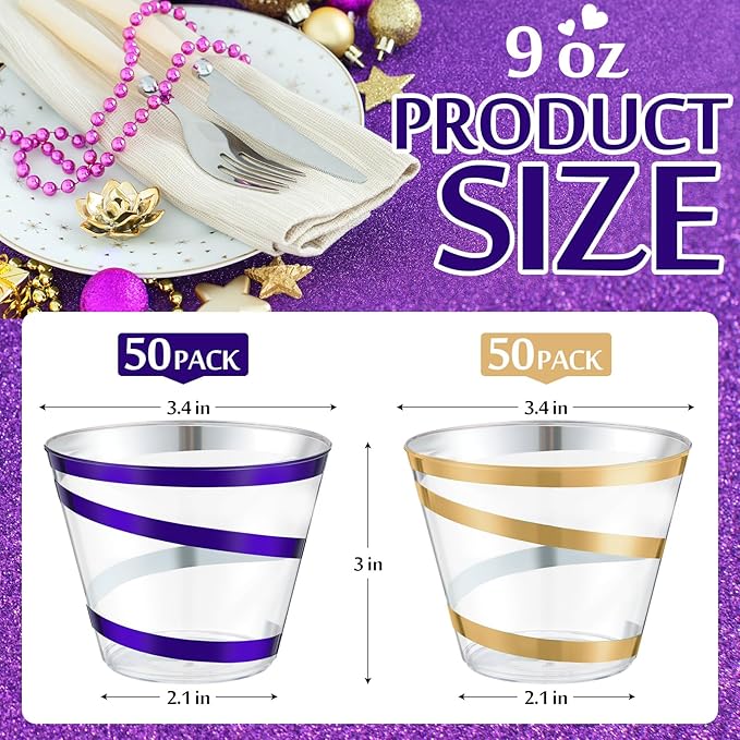 Gejoy 9 oz Rimmed Swirl Plastic Cups Disposable Wine Drinking Cups Clear Elegant Halloween Tumblers for Christmas Party Supplies(Purple, Gold,100 Pcs)