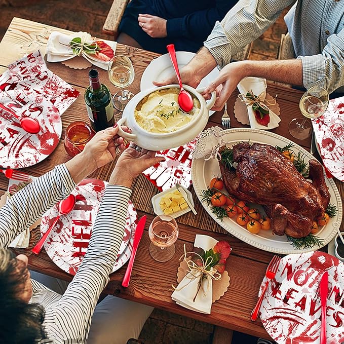 - 【Bloody Halloween Party Supplies】This Halloween Bloody Handprint party supplies includes 24pcs 9” plates, 24pcs 7” plates, 24pcs napkins, 24pcs cups, 24pcs forks,spoons and knifes. This Halloween party supplies can easy hold 24 guests to enjoy a perfect meal