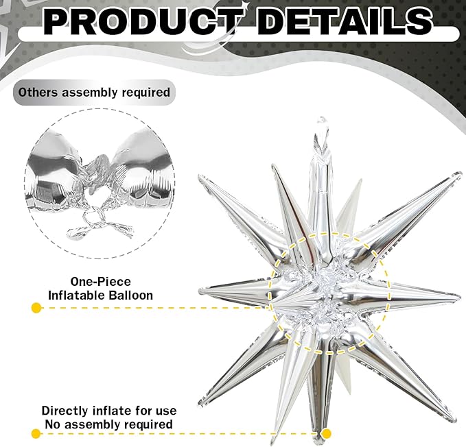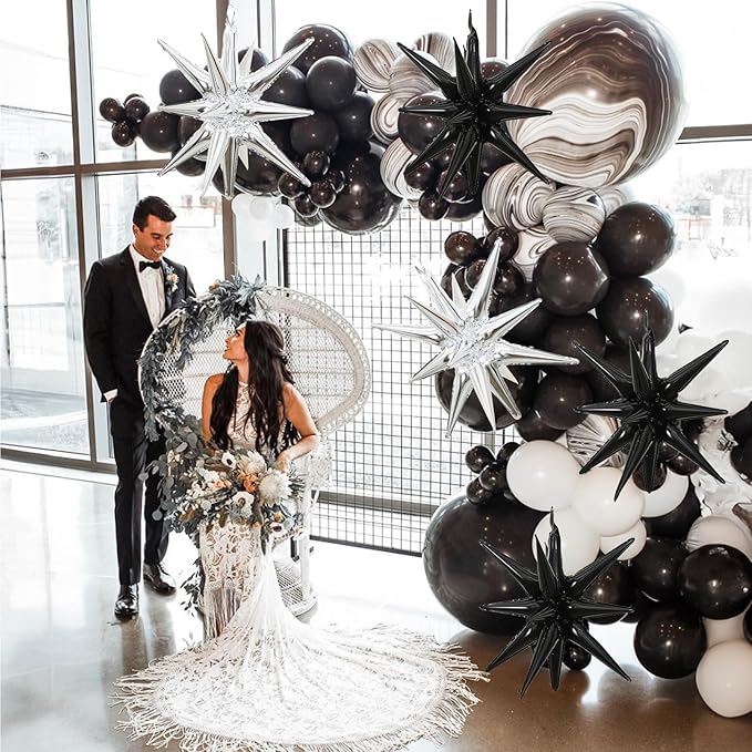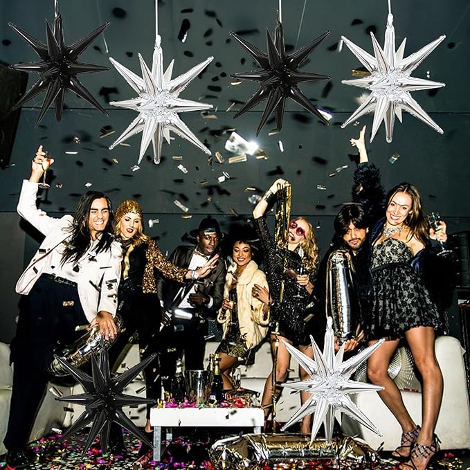 - Star Foil Balloons: This set includes 6 pieces of 22-inch, one-piece, 14-pointed star balloons in striking colors: black and silver. These star-shaped balloons add a touch of elegance and style to your party and are ideal for any celebration