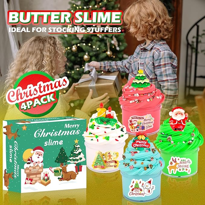 Christmas Butter Slime Kit 4 Pack, Santa Claus, Xmas Tree, Wreath, Candlestick Charms Mix Ins for Girl Boy, Holiday Slime for Christmas Stocking Stuffers, Premade Xmas Slime Kids Party Favors
