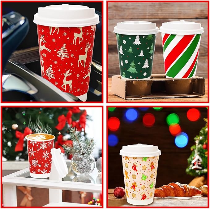 - Five Festive Designs for Every Taste: Our 12-ounce disposable cups come in five charming Christmas designs, including reindeer, red and white snowflakes, Christmas trees, candy canes, and gingerbread men. Each cup is perfect for holding a variety of beverages, and the robust, leak-proof lids ensure a secure seal. Enjoy your favorite drinks during busy workdays, and make your holiday parties memorable with these festive cups, complete with 100 stirrers for convenience.