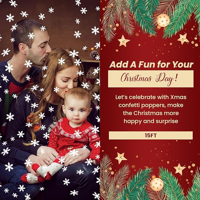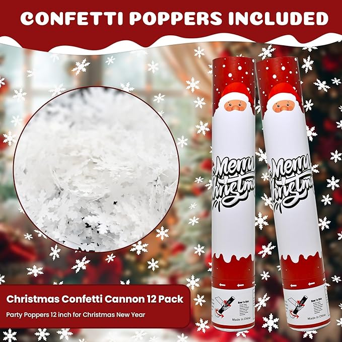 - Confetti Cannon Christmas 12Pack - Each confetti cannon for Christmas includes 12 pack snowflakes confetti poppers filled with dazzling Christmas confetti. Add surprise to your celebration with confetti popper cannons for Xmas. Perfect for creating a memorable highlight, these poppers will make your special moments shine bright and bring the party to life!