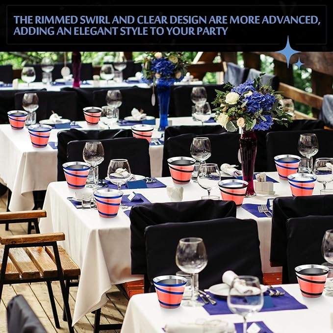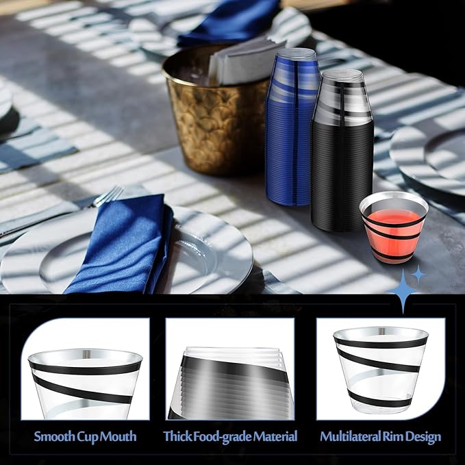 - Elegant and Exquisite Design: the elegant trim swirl around our 9 ounce clear plastic cups add a touch of elegance to your table in party or home kitchen and leave your guest a good impression with these exquisite plastic cups
