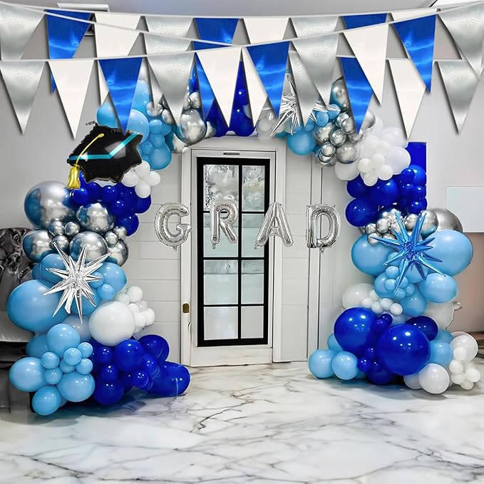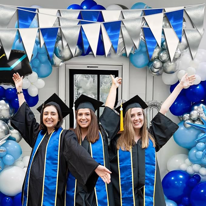 - 【Navy Blue White Silver Pennant Bunting Set】: The total length of the Navy Blue White Silver Triangle banner is 130 feet, divided into4 strips, each 32.8 feet long. Each Pennant Banner 80Flag Size: 7.87''/20cm width x 11.8''/30cm height for birthday decorations many occasions, and so on