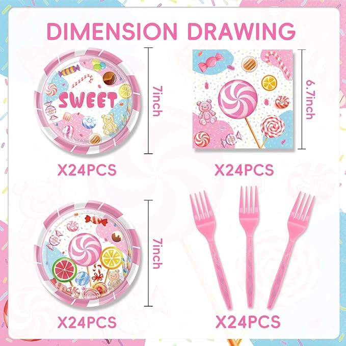 - 【Your Ultimate Party Set】This Candyland themed party supplies is the ultimate party essential! It includes 24 large 9-inch plates, perfect for serving birthday cakes, pizzas, and other hearty dishes; 24 smaller 7-inch plates ideal for desserts, fruits, and snacks; and 24 adorable pink forks and 24 coordinating napkins. Whether you're serving a towering birthday cake or delicate desserts, this set has you covered!