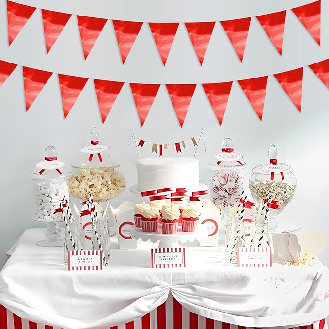 - 【Red Pennant Bunting Set】: The total length of the Red Triangle banner is 65.6 feet, divided into 2 strips, each 32.8 feet long. 40Flag, Each Pennant Banner 40Flag Size: 7.87''/20cm width x 11.8''/30cm height for birthday Themed Party Decoration many occasions, and so on