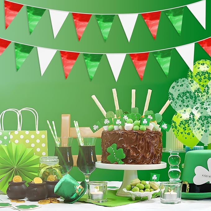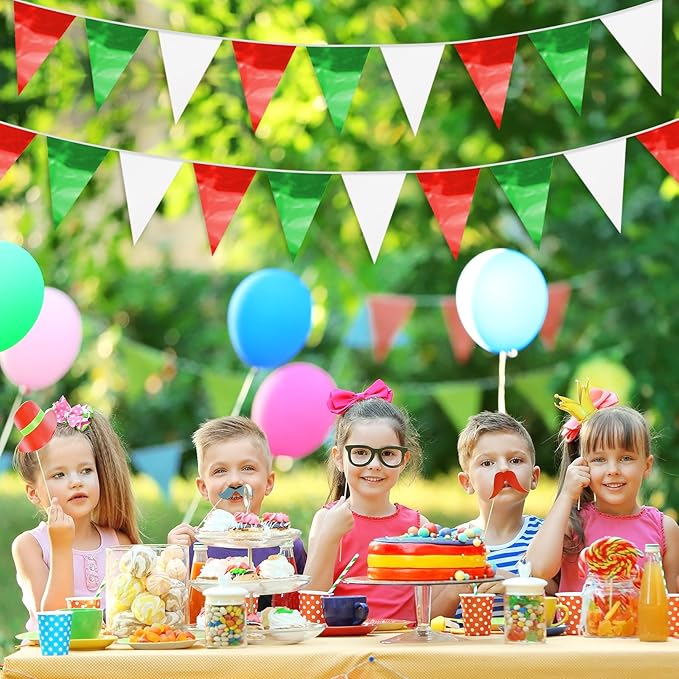 - 【Red Green White Pennant Bunting Set】: The total length of the Red Green White Triangle banner is 65.6 feet, divided into 2 strips, each 32.8 feet long. 40Flag, Each Pennant Banner 40Flag Size: 7.87''/20cm width x 11.8''/30cm height for birthday Themed Party Decoration many occasions, and so on