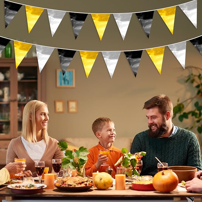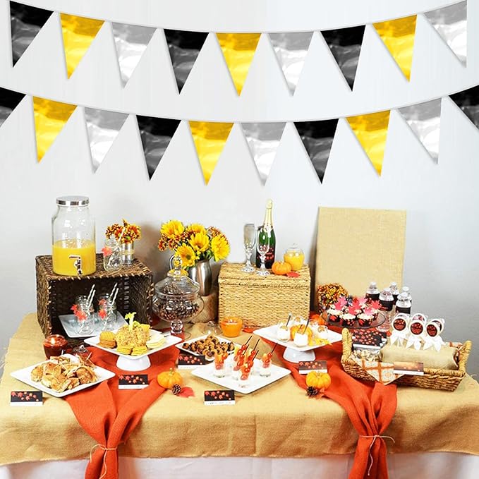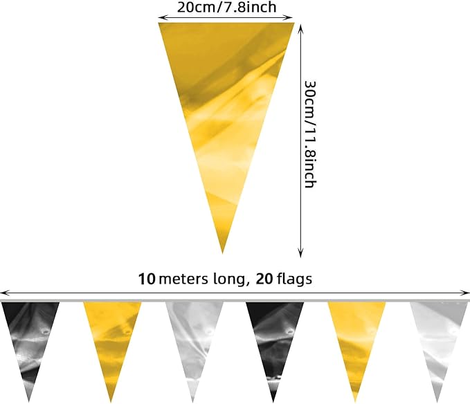 - 【Black Gold Silver Pennant Bunting Set】: The total length of the Black Gold Silver Triangle banner is 65.6 feet, divided into 2 strips, each 32.8 feet long. 40Flag, Each Pennant Banner 40Flag Size: 7.87''/20cm width x 11.8''/30cm height for birthday Themed Party Decoration many occasions, and so on