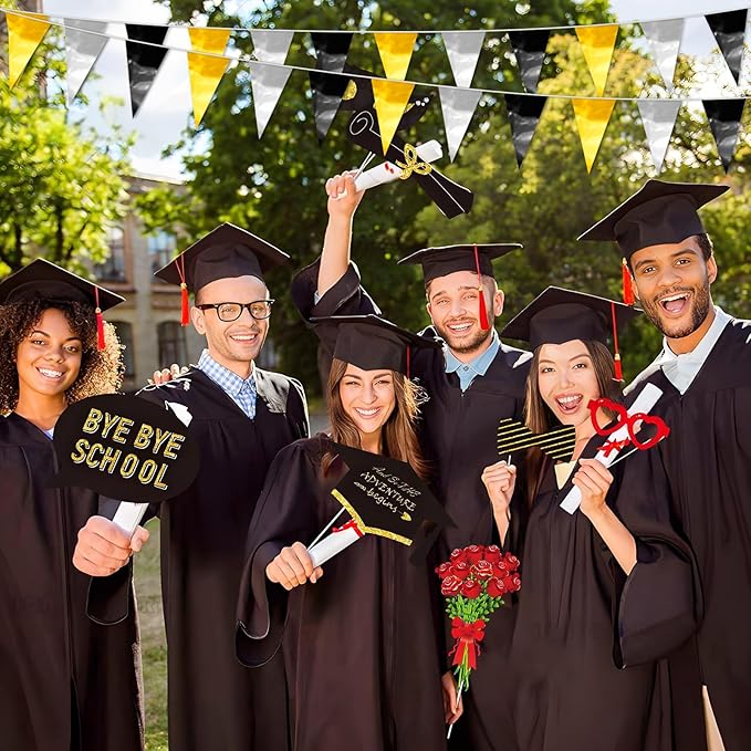 65FT Black Gold Silver Glitter Triangle Pennant Banner Flag Metallic Bunting Fabric Garland for Christmas Wall Hanging,Graduation, New Years Decorations,Father' Da Decorations Party Supplies