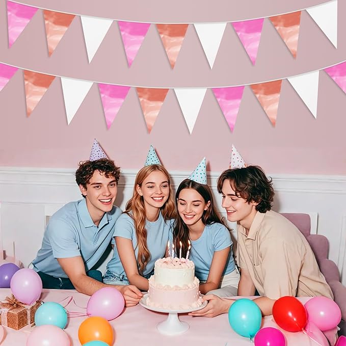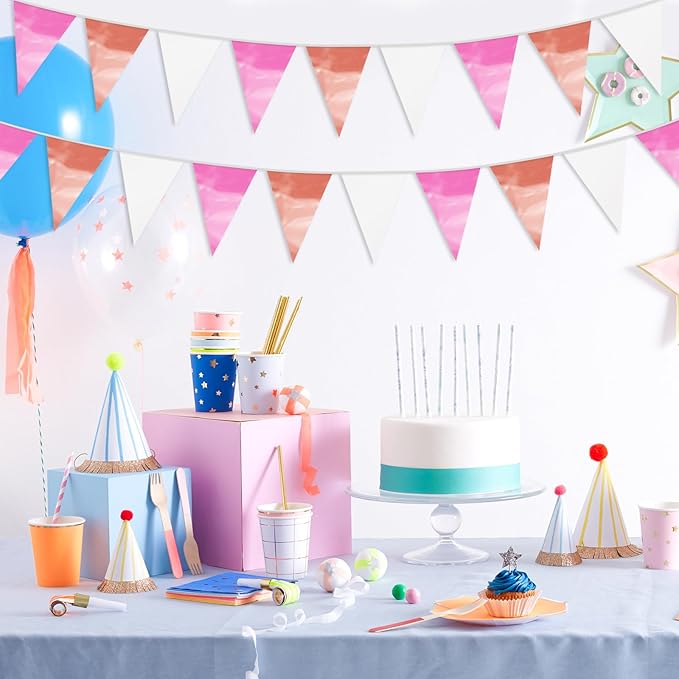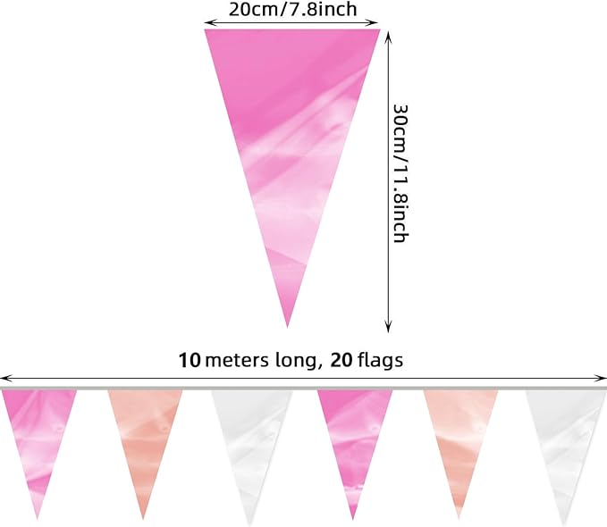 - 【Rose-Gold Pink Pennant Bunting Set】: The total length of the Rose-Gold Pink Triangle banner is 65.6 feet, divided into 2 strips, each 32.8 feet long. 40Flag, Each Pennant Banner 40Flag Size: 7.87''/20cm width x 11.8''/30cm height for birthday Themed Party Decoration many occasions, and so on
